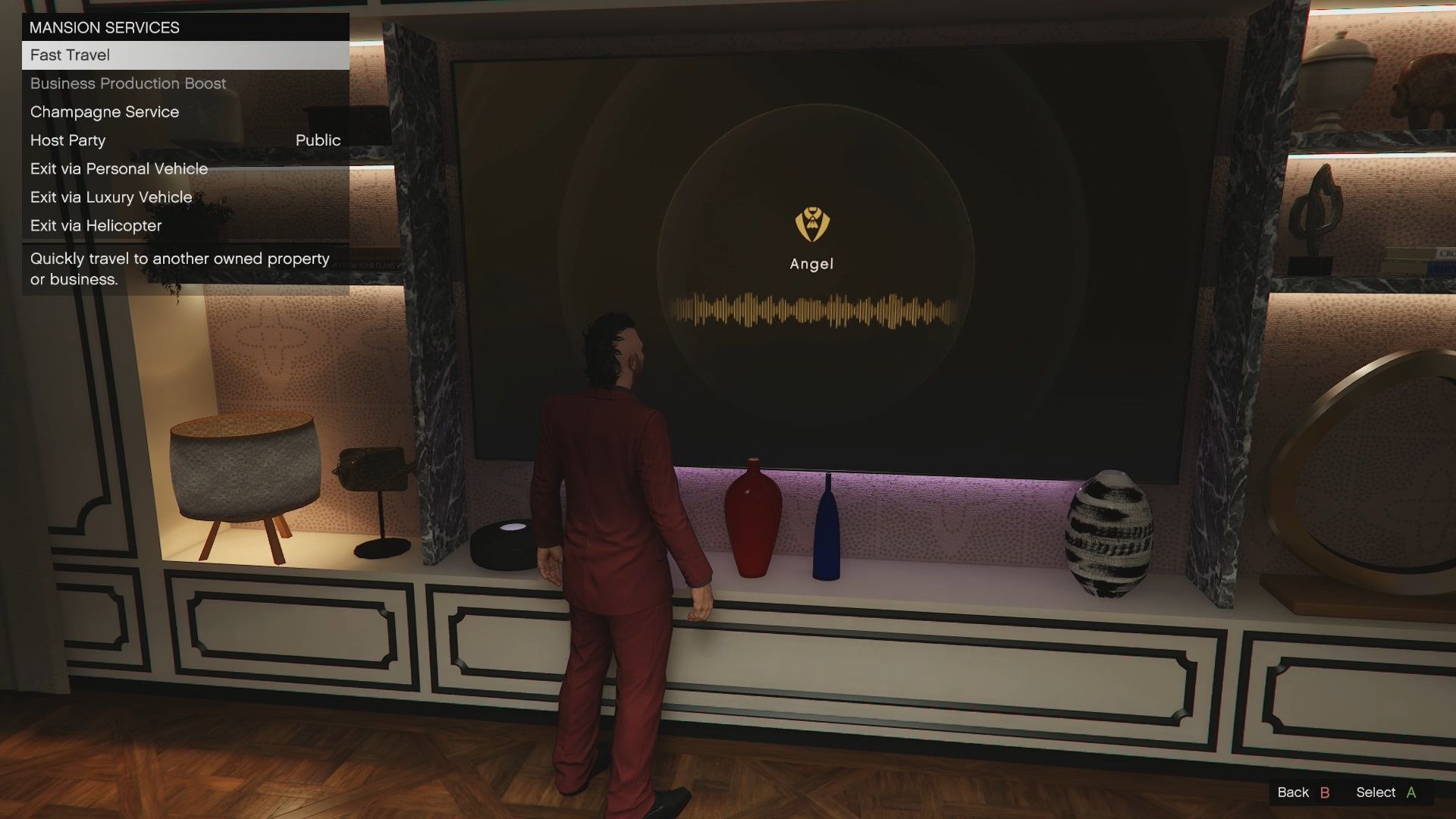 Your AI assistant let’s you use the mansion’s various services, including Fast Travel, Business Production Boost, Champagne Service, the ability to host parties, and options to leave the property using a personal vehicle, luxury vehicle, or helicopter.