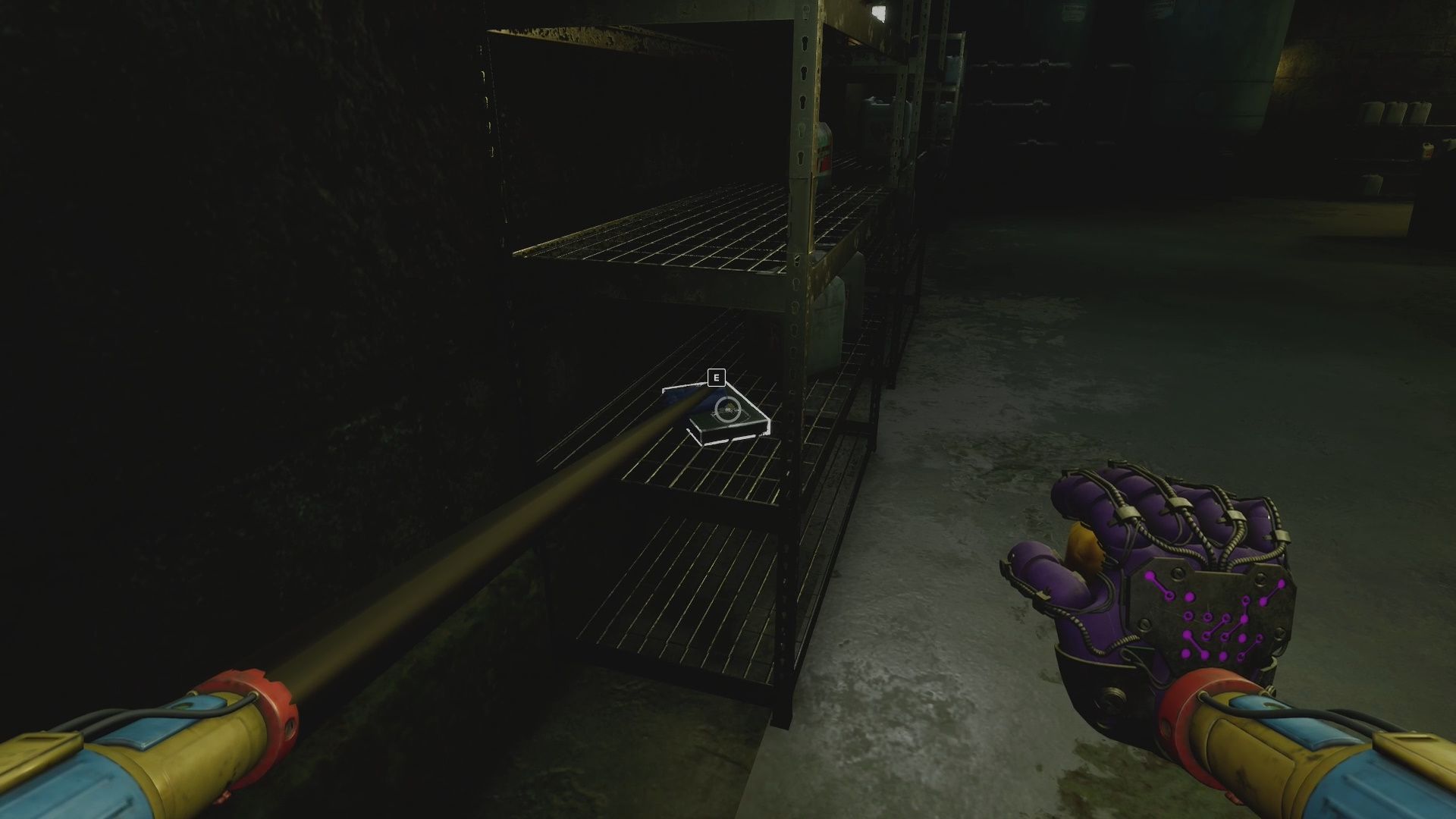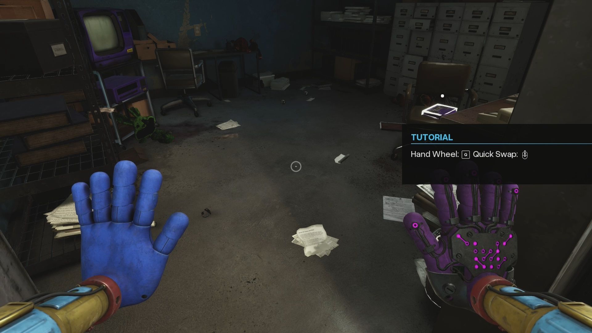 In The Foundation room with all of the pipes you will go into an Office to get the Purple Keycard. Go through this Office, swing across to the other catwalk. Go forward on the catwalk. Grab the Cyan VHS Tape off the barrel. Return to the Office to watch it on the Cyan VCR.