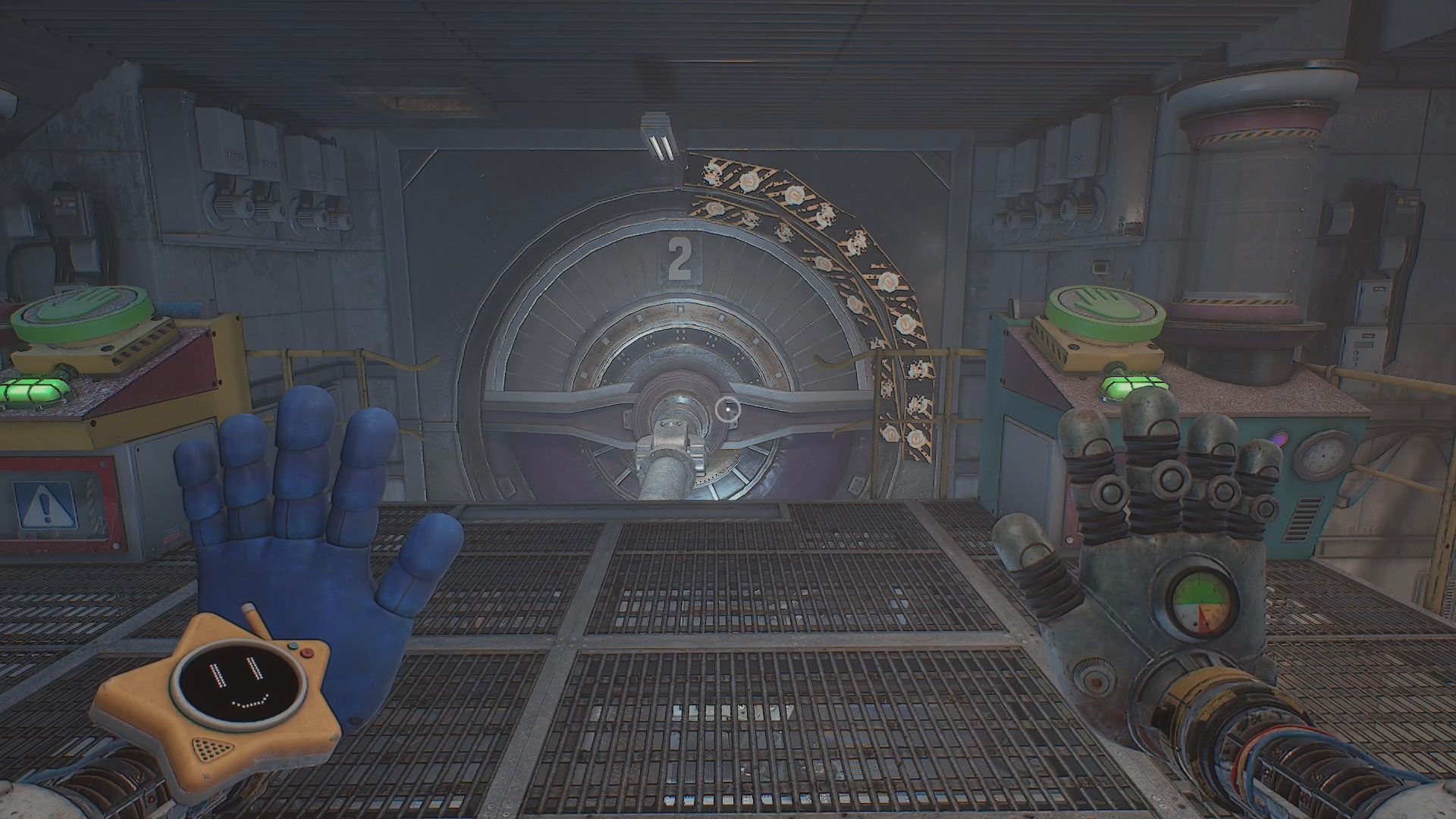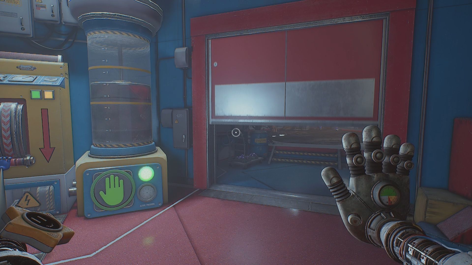 In the next area you will arrive at a Red Door with a Pressure Tank and Switch next to it. The Pressure Tank has a Green Hand button. Use your Pressurized Hand to pressure it up to between the two yellow lines then use the handle open the door.