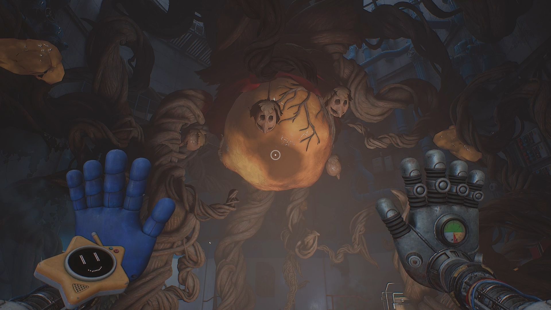 There is a large tree in the middle of the room. On this tree there are 7 yellow sacs on the different roots. Destroy them to reveal three branches highlighted in white. Break those branches.