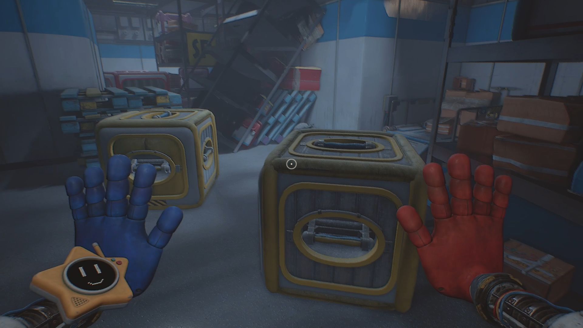 In the next room you will enter a huge Storage Room with multiple sections. The first section you need to simply move the Yellow Crates over to the Blue Pallets in the middle of the room. Use them to jump onto the Pallet to enter the next section.